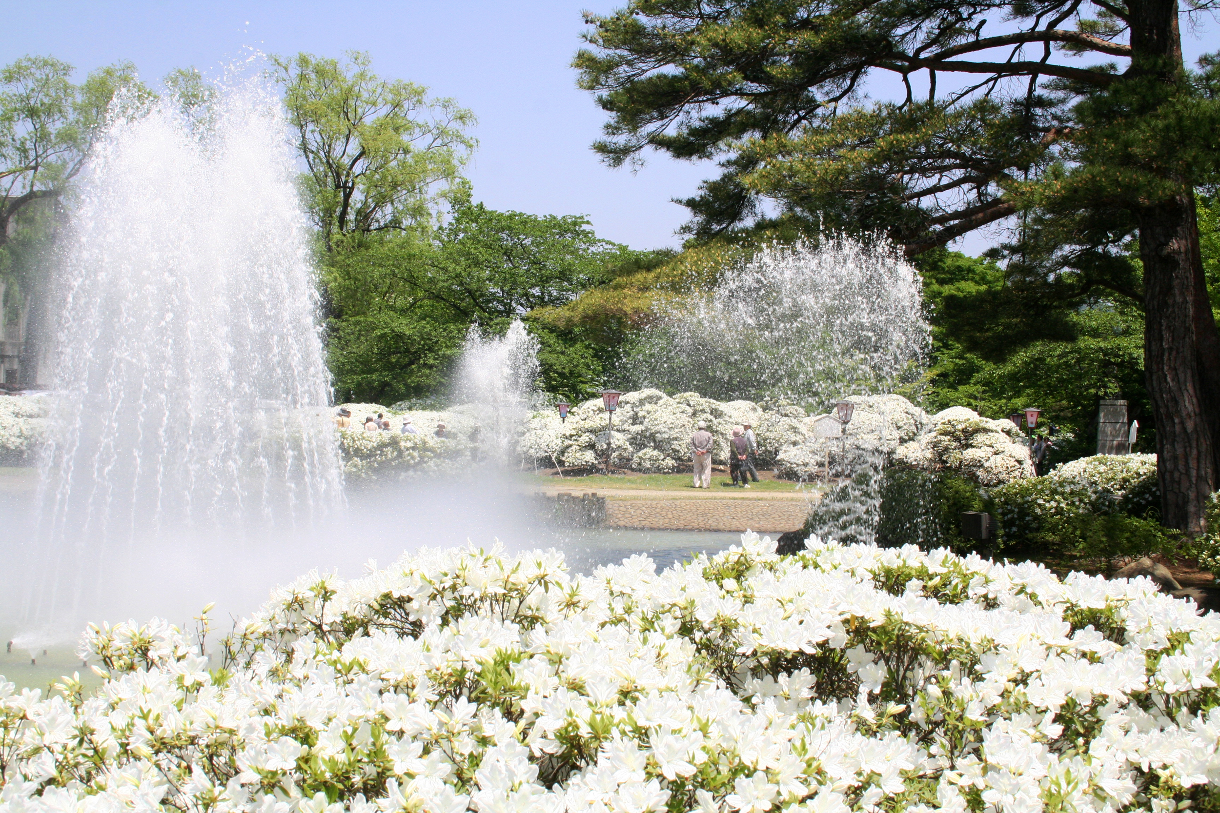 明治17・18年頃小出区民が公園化しようと整備、造成を始め、当時の長井町の発展と産業振興に功績を残した横山孫助氏らが明治29年に池を掘り、松などを移植し「松ヶ池公園」が作られました。これが現在の白つつじ公園の始まりです。その後、花作町の「七兵衛つつじ」をもらい受け、明治43年、「つつじ公園」の名を用いるようになりました。 琉球種白つつじ約3000株が咲き誇る、長井を代表する花公園のひとつで、5月の満開時には一面純白の世界が広がり、まるで雪が降り積もったかのようになります。園内中心部には樹齢750年と伝わる「七兵衛つつじ」と呼ばれる古木のつつじ群もあり、市の天然記念物に指定され、風格の漂うその姿は必見です。冬の雪囲い作業は冬の訪れを知らせる季節の風物詩ともなっています。 6ヘクタールの広い園内には、つつじ以外にも様々な樹木が植えられ、噴水のある池や滝を結ぶせせらぎや、園路が張り巡らされ、子供向けの遊具があり、新緑から紅葉の季節まで、観光客のみならず市民の憩いの場となっています。