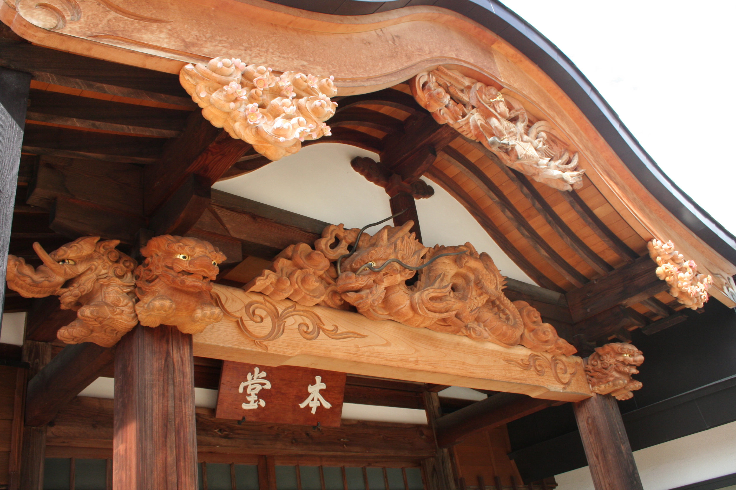 創立以来、何度か火災にあり詳細な寺史は不明だが、現存する仏像や書物から推測すると、天文24(1555)年の銘のある薬師如来の厨子が残されています。本尊は薬師如来坐像、正しくは薬師瑠璃光如来という高さ40cmほどの坐像。この他、宝物や石碑など文化財が多くあり、最近では、位牌堂、本堂、薬師堂玄関の桁に荘厳な彫刻の四季の絵柄が施され備えられました。