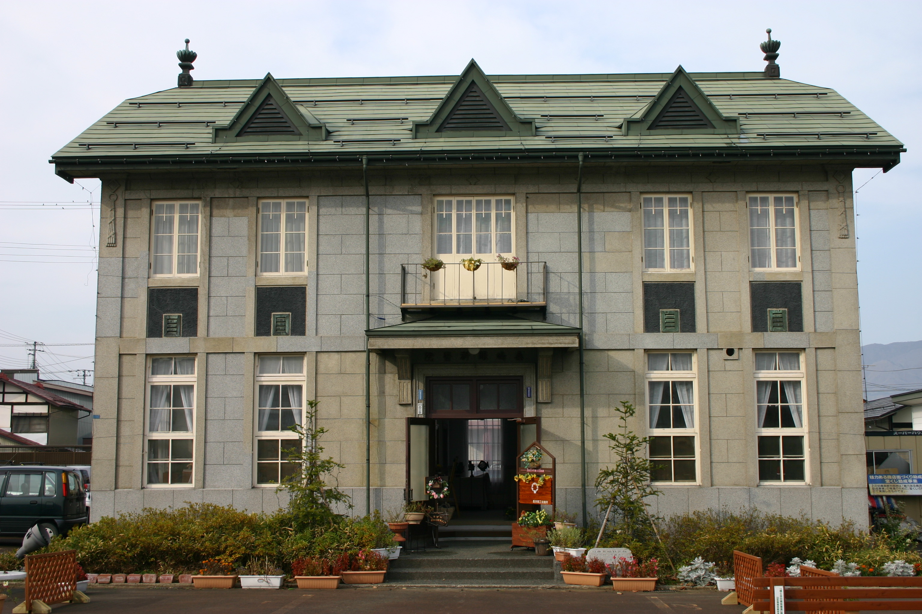 昭和2(1927)年に建てられた木造2階建ての西洋建築の建物。昭和初期の医院建築の貴重な遺産として市の有形文化財に指定されています。 鉄筋コンクリート造りのように見えますが、石造りに似せた人造石洗い出しの外壁、ゴシック建築の名残の棟飾りやドーマウィンドウ(屋根喚起口)、バルコニー付玄関などの特徴があります。 平成7年に桑島眼科医院の改築が始まり、旧医院が取り壊されることになりましたが、市民主体の保存活動により本町駐車場の一角に移転し、今なおその美しい姿を残しています。